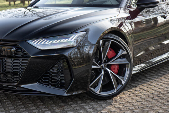 Slechts weinig dingen zijn adembenemend mooi te noemen. Deze optionele 22 inch velgen zijn de uitzondering op de regel. Het exclusieve 5-V-spaak structuur-design is afgewerkt in glanzend gepolijst antracietzwart. Een andere begerenswaardige RS-optie zijn de keramische remmen, herkenbaar aan de blauwe remzadels met Audi ceramic-opschrift.