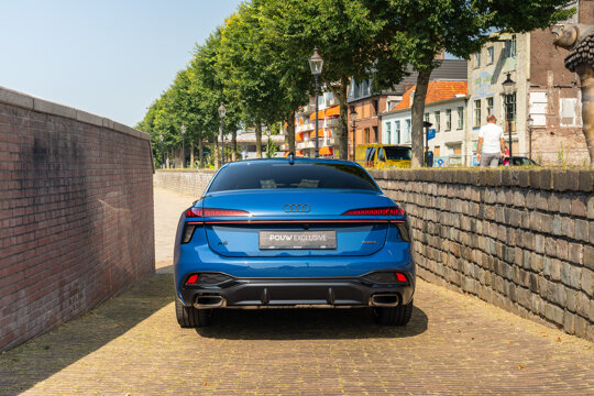 De Audi A6 Limousine e-hybrid quattro heeft een unieke lichtsignatuur die hem dag en nacht direct herkenbaar maakt. De slanke koplampen en de doorlopende LED-lichtstrip achter benadrukken de breedte en geven een moderne, sportieve uitstraling.