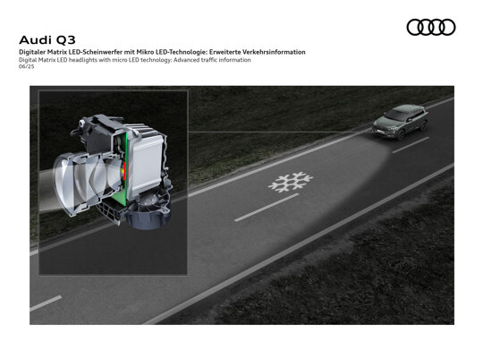 In de nieuwe Audi Q3 worden digitale matrix LED-koplampen met micro-LED-technologie voor het eerst aangeboden. Deze technologie is kleiner, lichter en efficiënter dan eerdere systemen. Elke koplamp bevat een module van slechts 13 millimeter breed met daarin 25.600 afzonderlijk aanstuurbare micro-LED’s. Dankzij deze techniek kan de Audi Q3 zijn lichtbeeld dynamisch aanpassen aan de verkeerssituatie. Zo worden oriëntatielichten en rijstrookgeleiding geïntegreerd met rijhulpsystemen.
