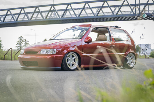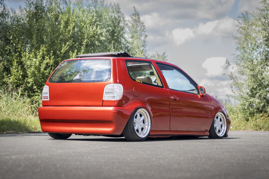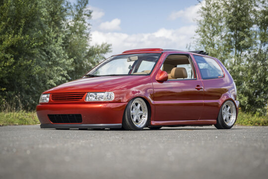 Ook technisch kreeg de Volkswagen Polo een metamorfose. Zo monteerde Corly luchtvering, iets wat al langer op zijn verlanglijst stond. “Eerder kon ik ’m niet zo laag zetten als ik wilde”, licht hij toe. “Door de verbrede wielkasten zakt hij nu precies tot de rand van de wielkast. Het was even puzzelen met de maatvoering, maar nu klopt het precies.” Eerst stond de Polo op cookie cutter-velgen van een Porsche 911, maar sinds vorig jaar liggen er tweedelige 15 inch OZ Executive-velgen onder. De techniek kreeg ook een upgrade. De originele 1,6-motor met acht kleppen (75 pk) maakte plaats voor een 1.6 16V uit een Lupo GTI, goed voor 125 pk. “Die motor kwam ik tegen op Facebook. De bak zou kapot zijn, maar dat bleek niet zo. Dus erin gehangen, kabelboom aangepast en hij liep perfect.”