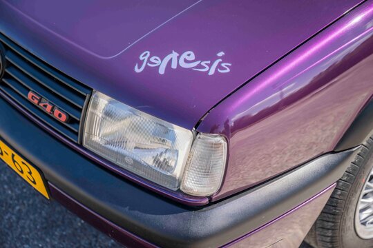 De Volkswagen Polo G40 Genesis is ontstaan uit een unieke samenwerking tussen Volkswagen en de Britse band Genesis, tijdens hun We Can’t Dance-tour in 1992. Eerder werkte Volkswagen al samen met The Rolling Stones, Bon Jovi en Pink Floyd voor speciale Golf-edities. De Polo Coupé G40 kreeg in dat kader een exclusieve Genesis-uitvoering: gespoten in Violet Touch Pearl Effect, met 13 inch BBS kruisspaakvelgen, carrosseriekleurige bumpers en spiegels, zwarte VW-logo’s, rode G40-badges en opvallende stickers met muziekinstrumenten.